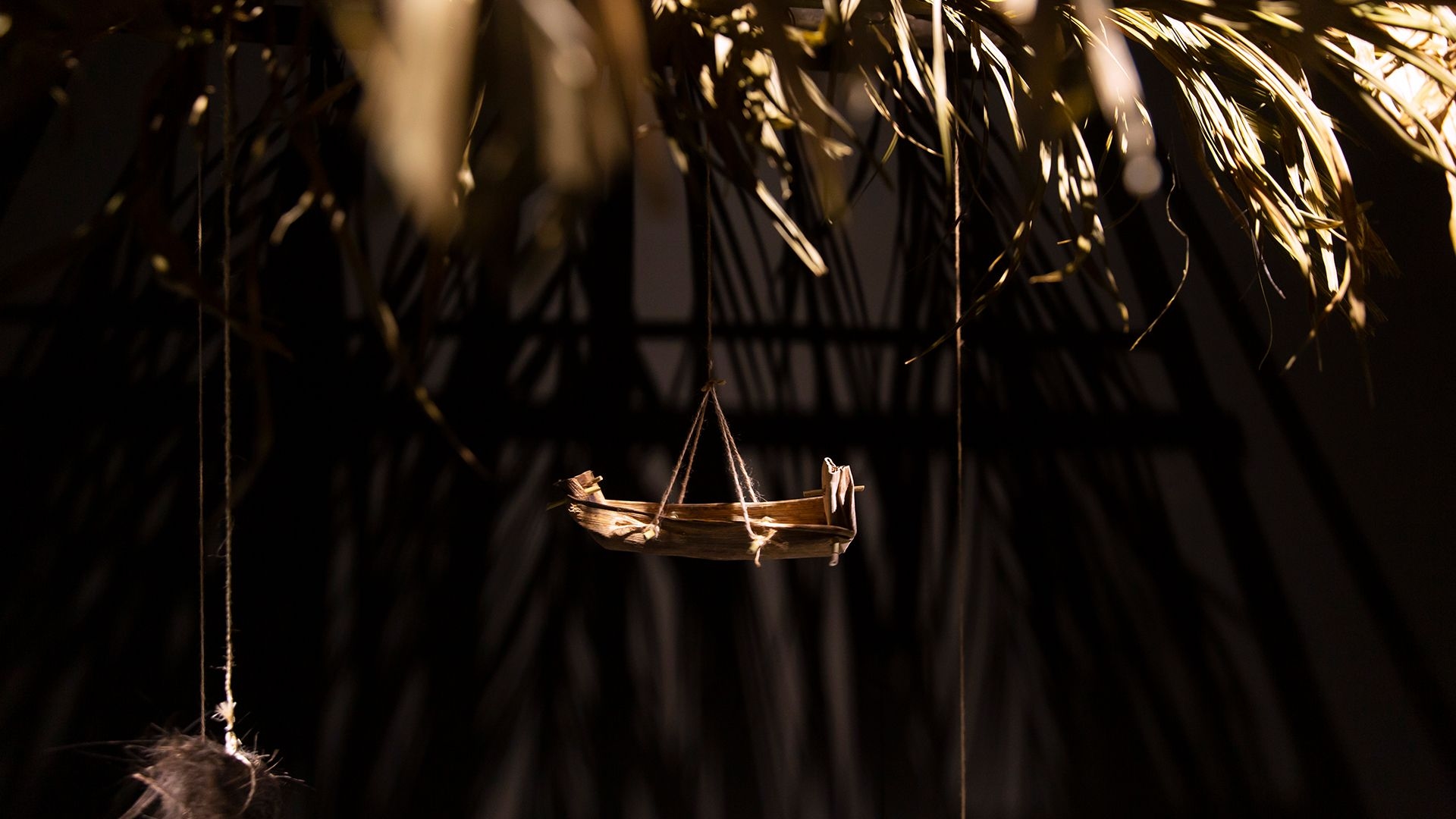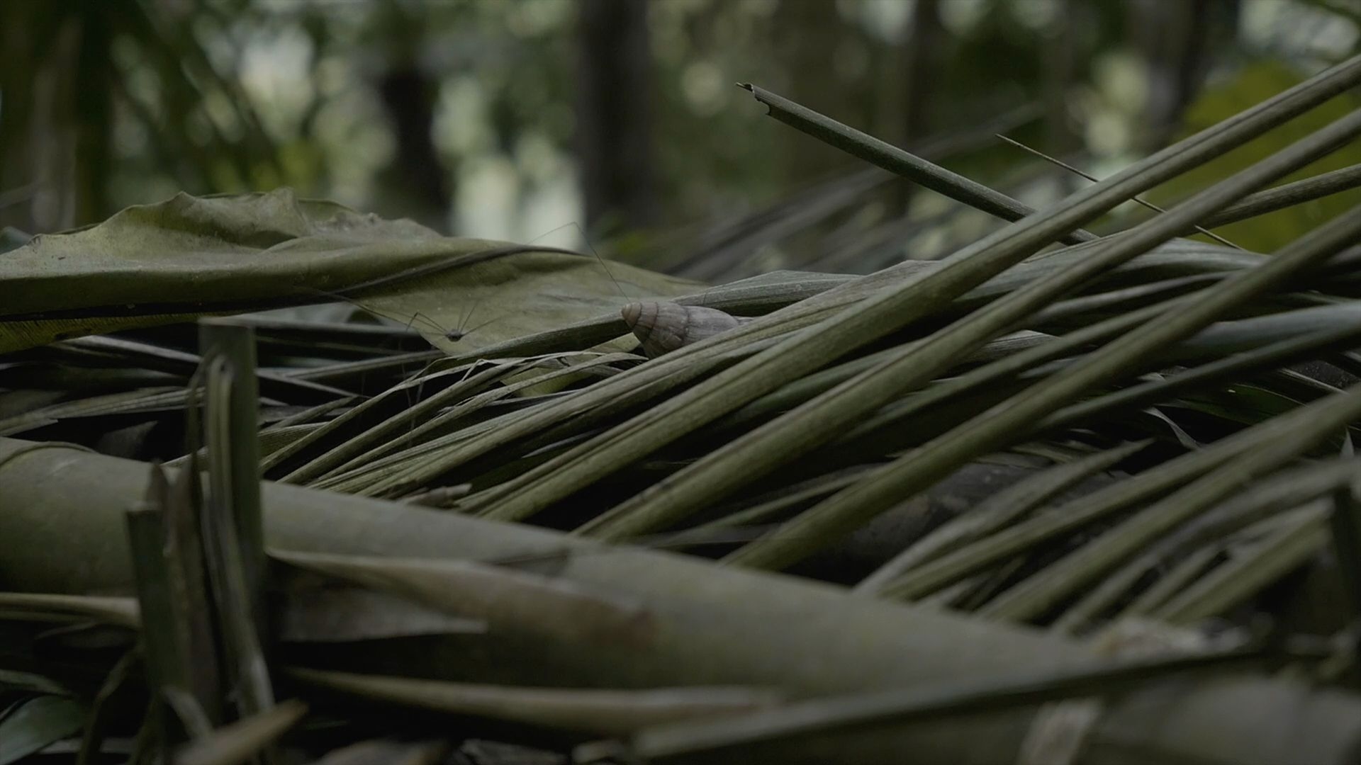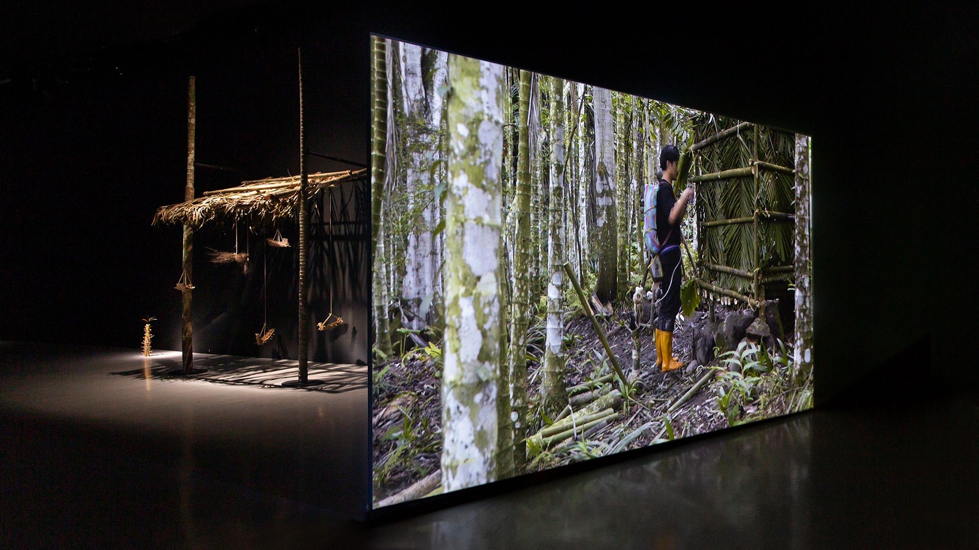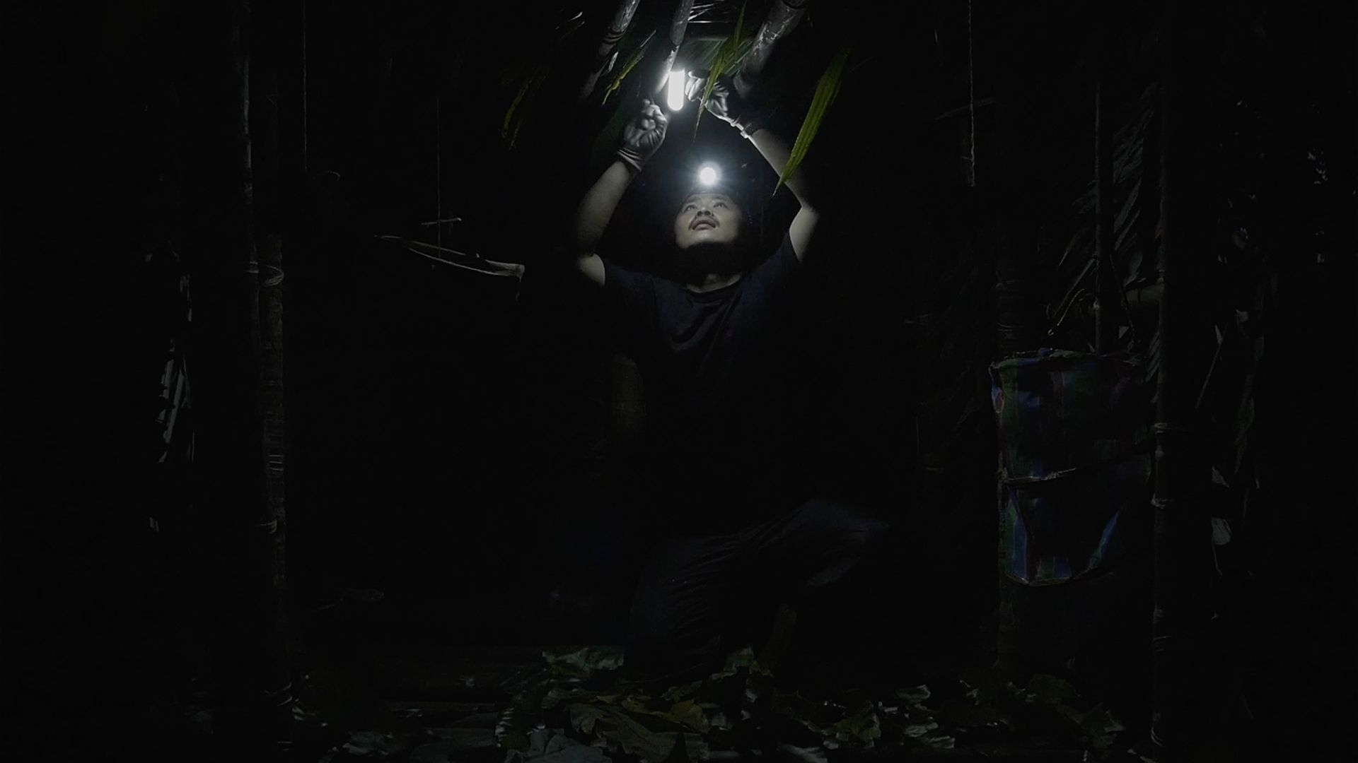 Betelnut Tree, Bird's-Nest Fern and African Snails is Ting-Tong Chang’s latest project created in 2020. It documents the artist’s two-week stay in a mountainous area, where he collaborated with a fern farmer and an Amis hunter. They created a dwelling place there using locally sourced materials and also placed traps and made inventive survival apparatuses. Through an installation consisting of a semi-documentary two-channel video and the dwelling place and apparatuses created, Chang presents connections between the following three indigenous species found in Taiwan’s natural landscape: betelnut tree, bird’s-nest fern, and African snails. He seeks to use an object-oriented perspective to reevaluate the trajectory of human history, with experiments conducted on transforming “art skills” into “survival skills”.