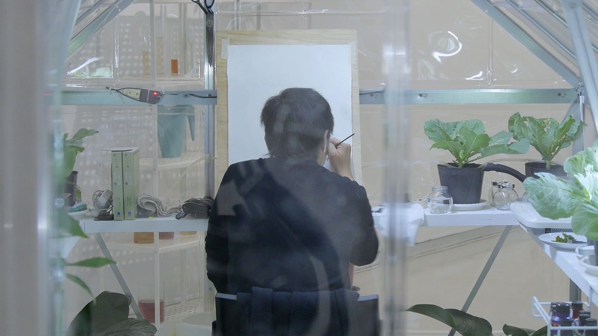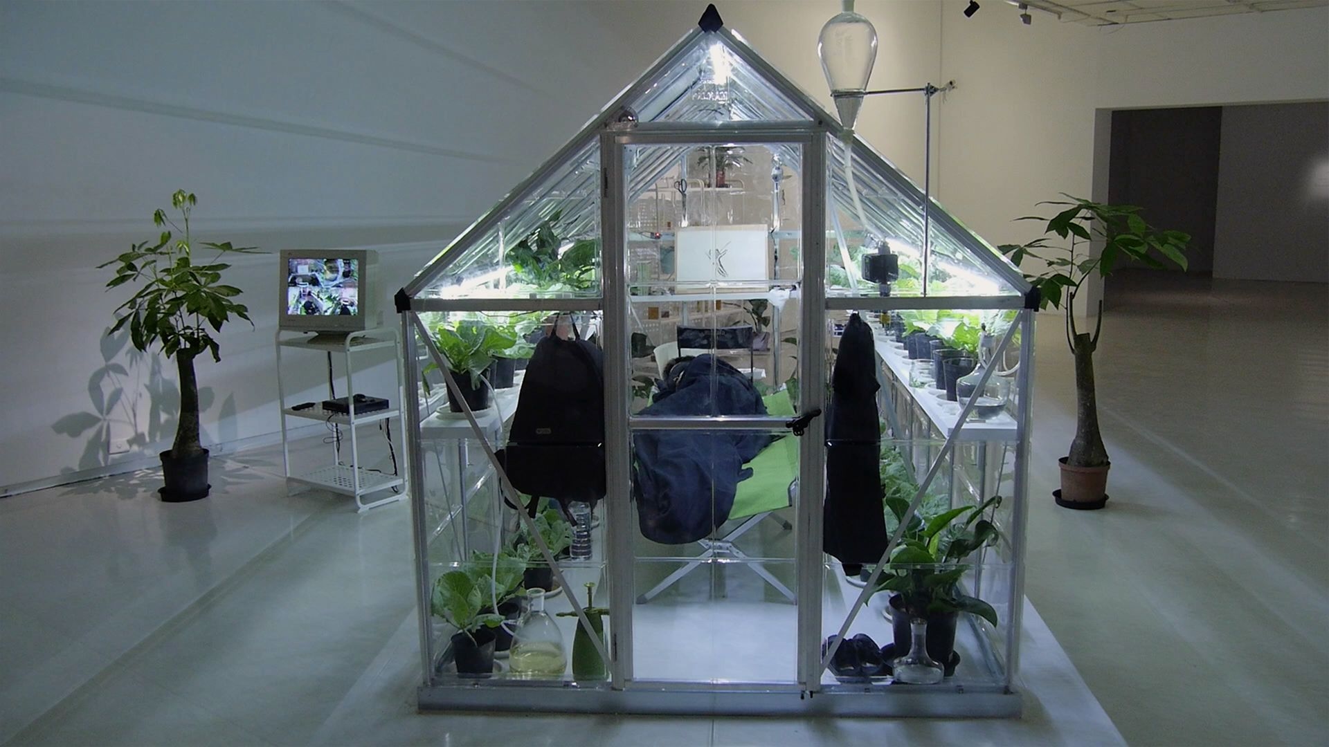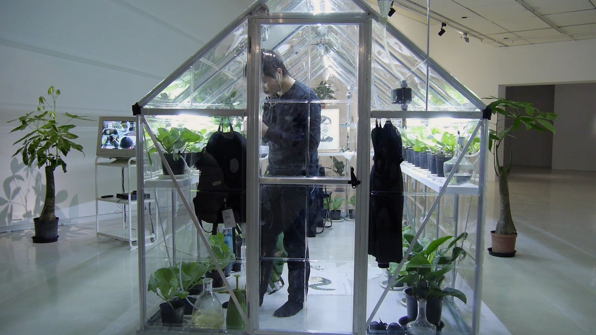 Spodoptera Litura was an experimental symbiotic mechanism developed in collaboration with the Department of Entomology at the National Chung Hsing University. The artist stayed in a greenhouse for two nights and three days where plants were grown and leaf worms (Spodoptera litura) were cultivated. The artist fed on the larvae for protein and collected his urine to water the plants through an irrigation system, thereby creating a small ecosystem. During his time in the greenhouse, the artist also created art and experimented with the possibilities of living a low carbon-emission life.