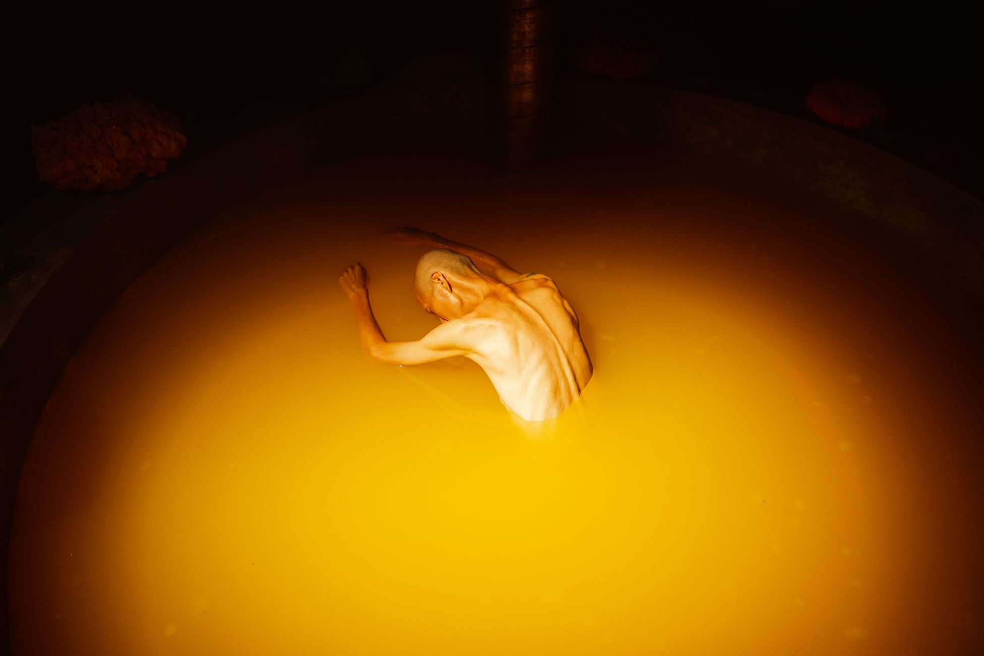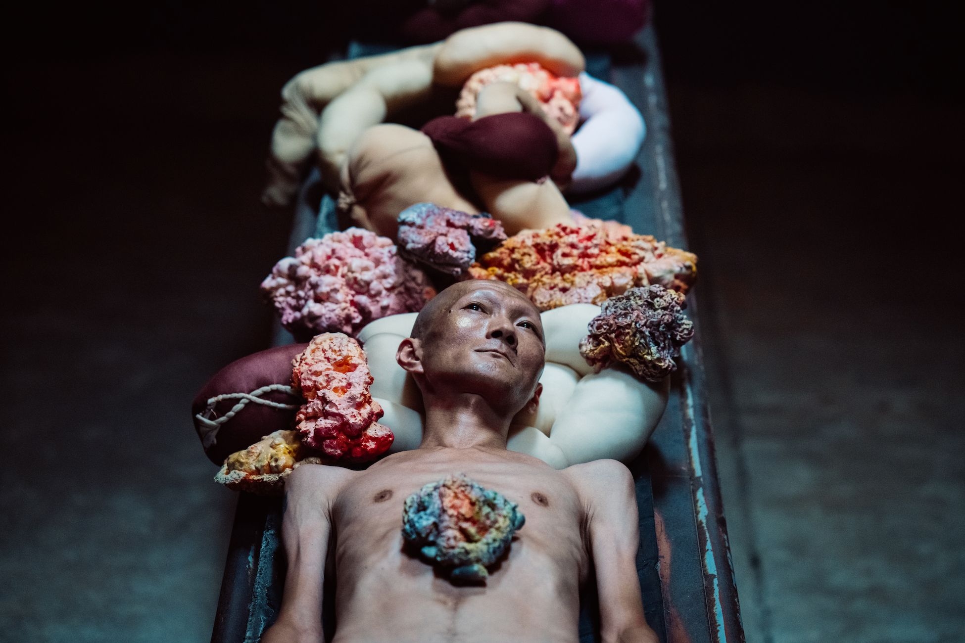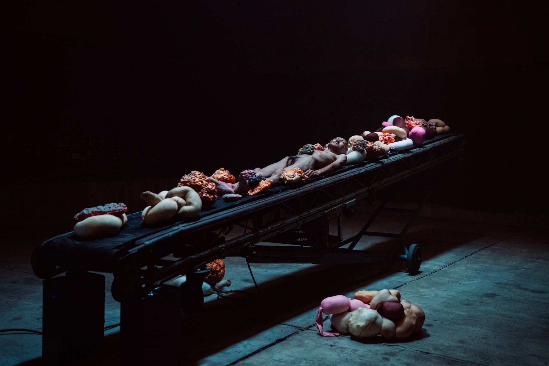 The artist invited performers to play different roles in the production process, such as workers who mechanically inspect soap on the conveyor belt and long table, victims sinking in large mixing tanks, and indifferent managers. Both the factory and the performance refer to how information is mass-produced and consumed across different media and social platforms.