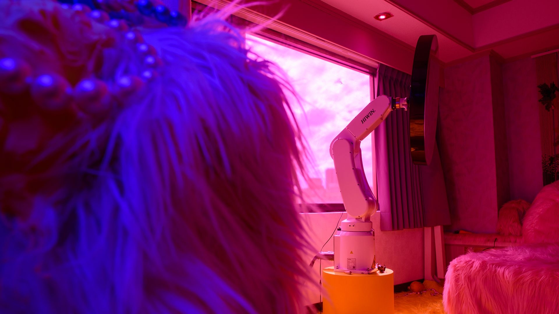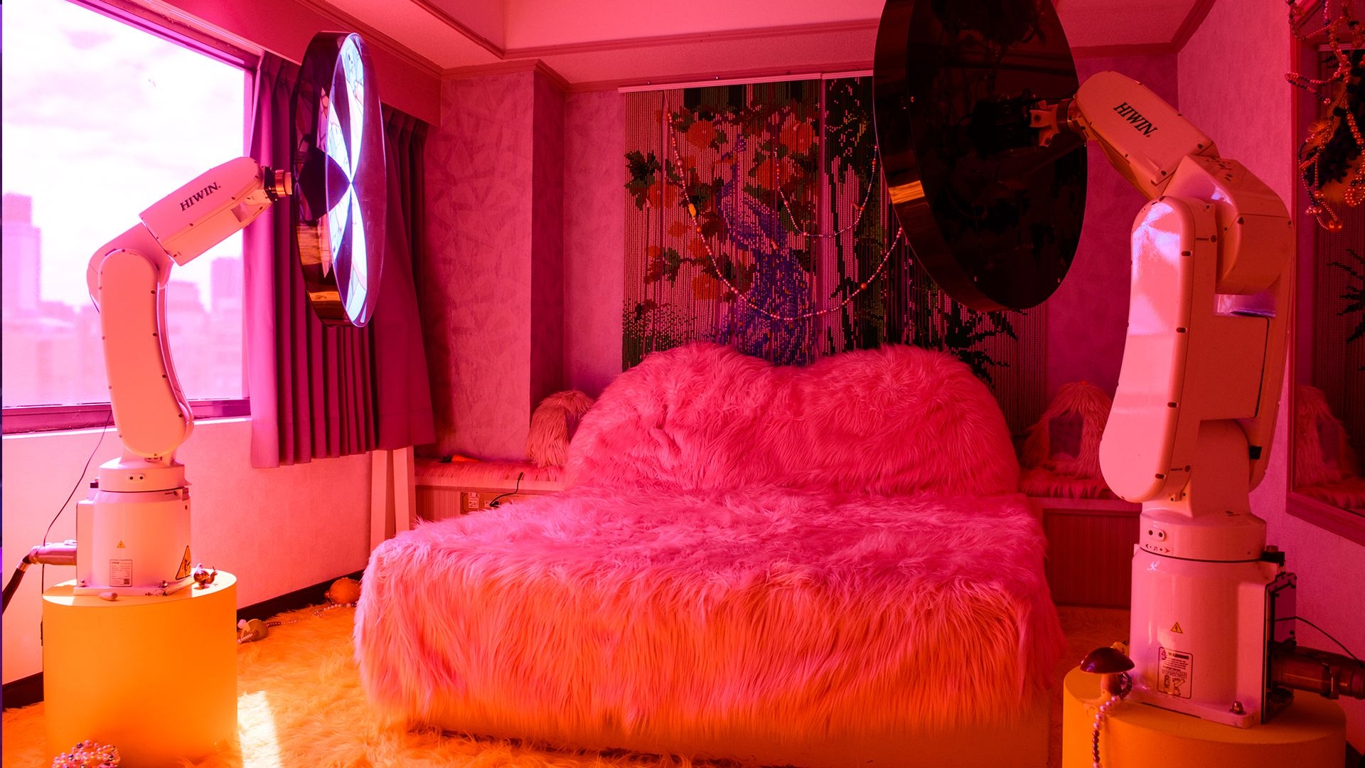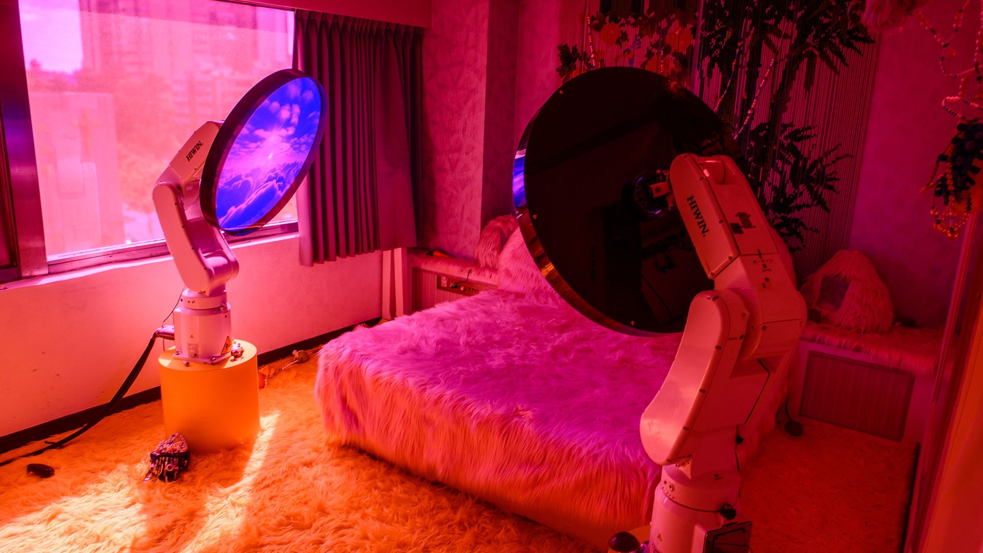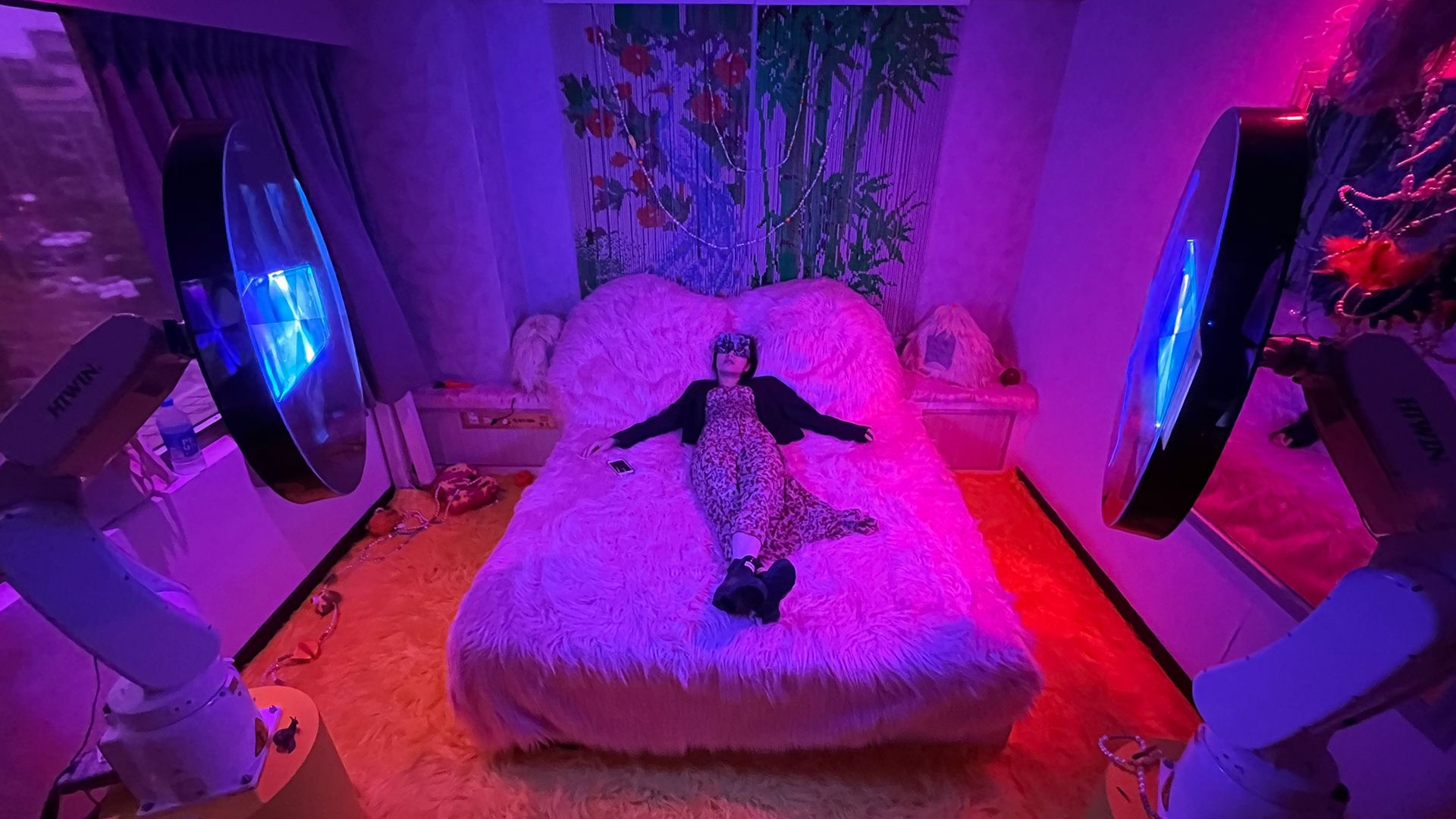 During the two-week exhibition, artists rented a room at the Chrysler Hotel and transformed it into immersive spacial experiences. Visitors to the exhibition must rent a 20 minutes slot at the counter and then enter the room alone to experience the works in an intimate way. Upon entering the exhibition room, visitors lie on a furry mattress surrounded by two robotic arms. The virtual girlfriend appears on the holographic projection screen mounted on the robotic arm, telling the audience the final story of the game.