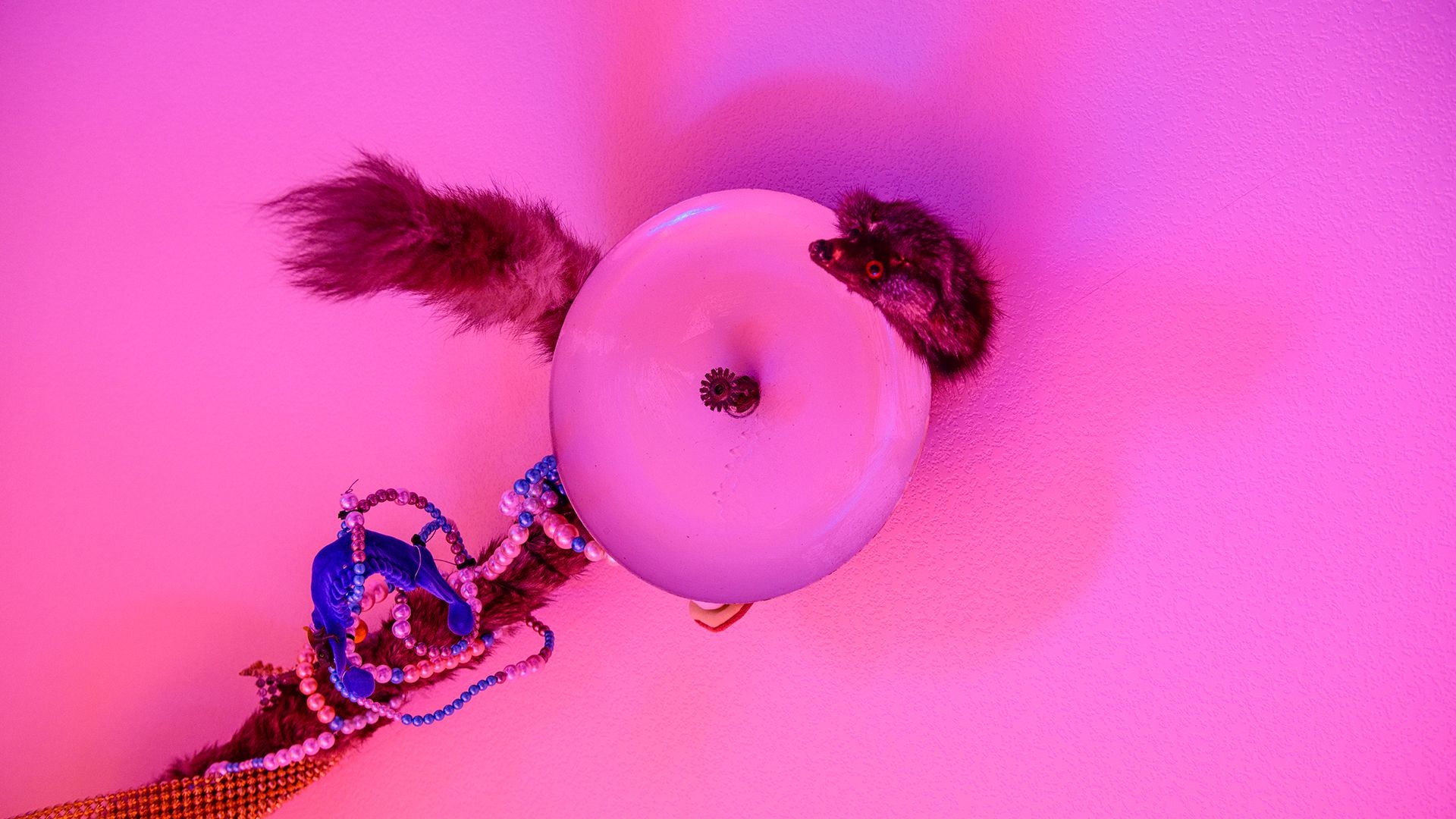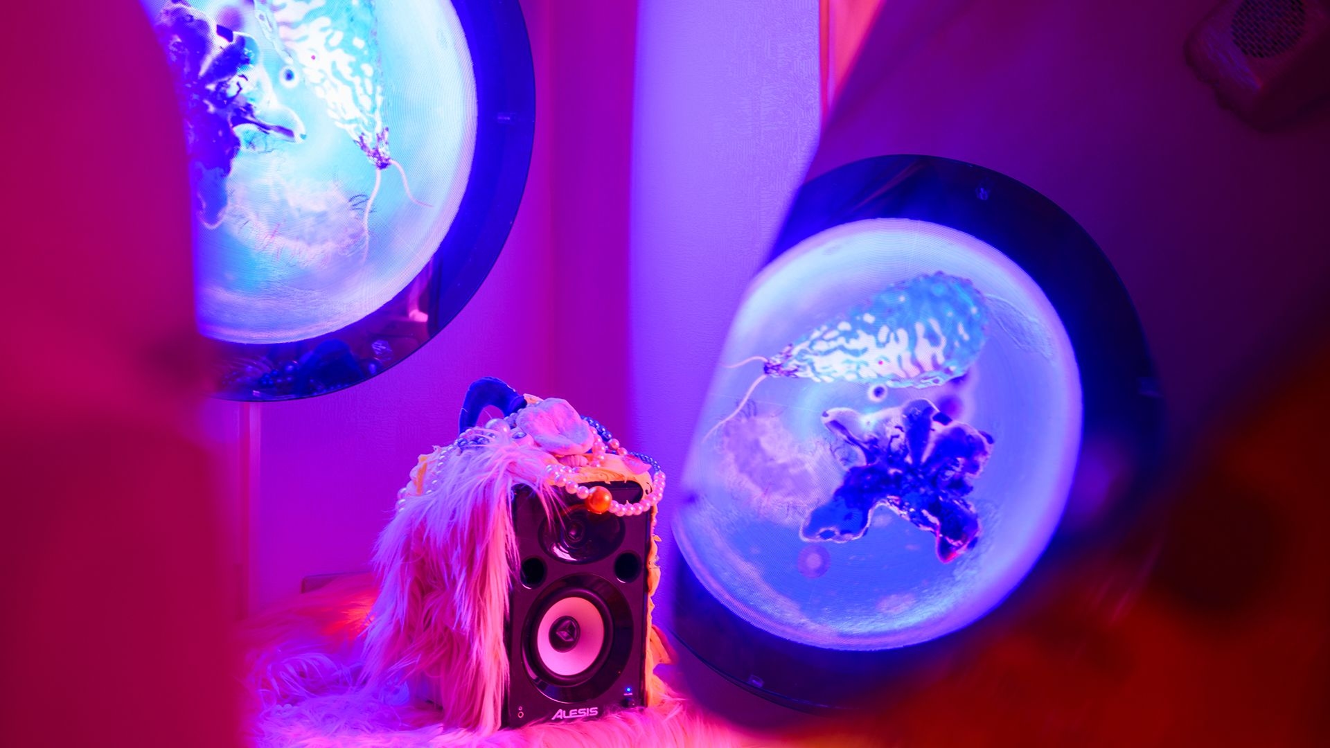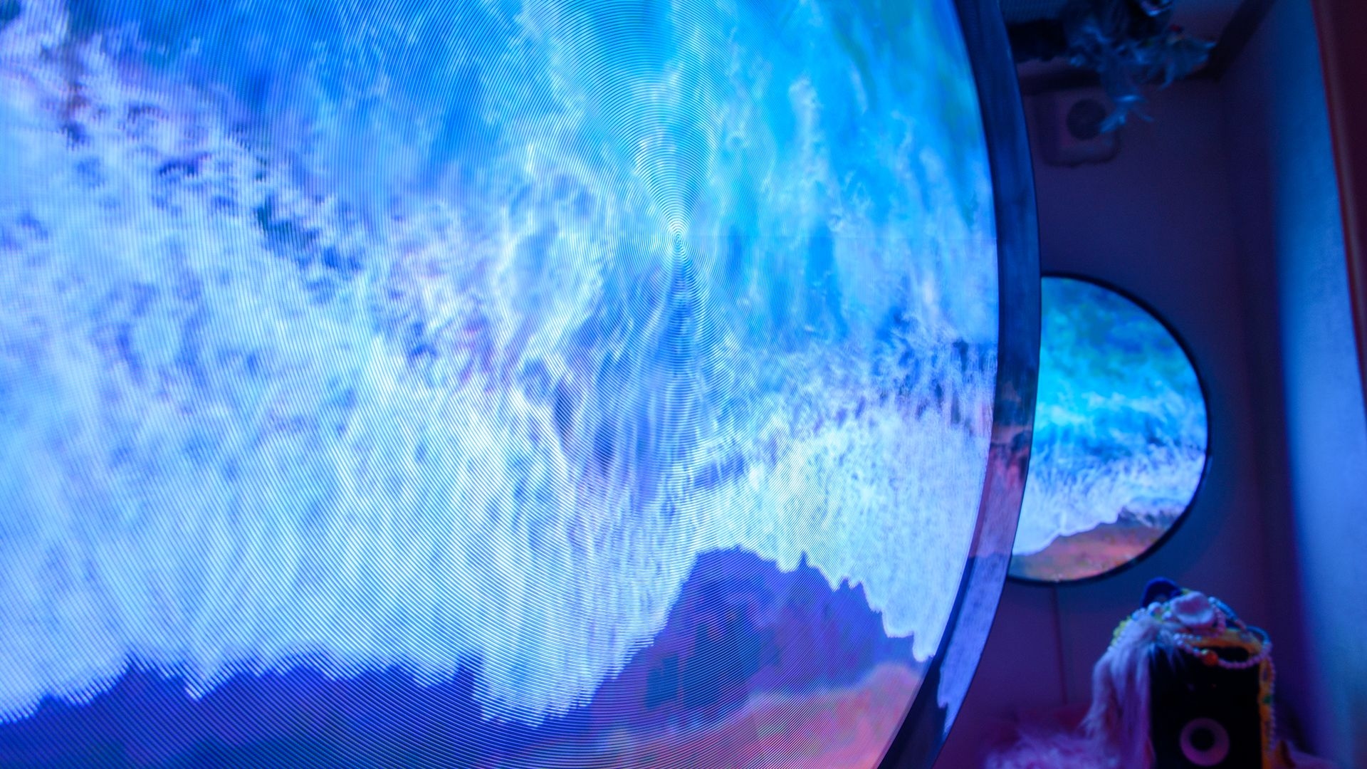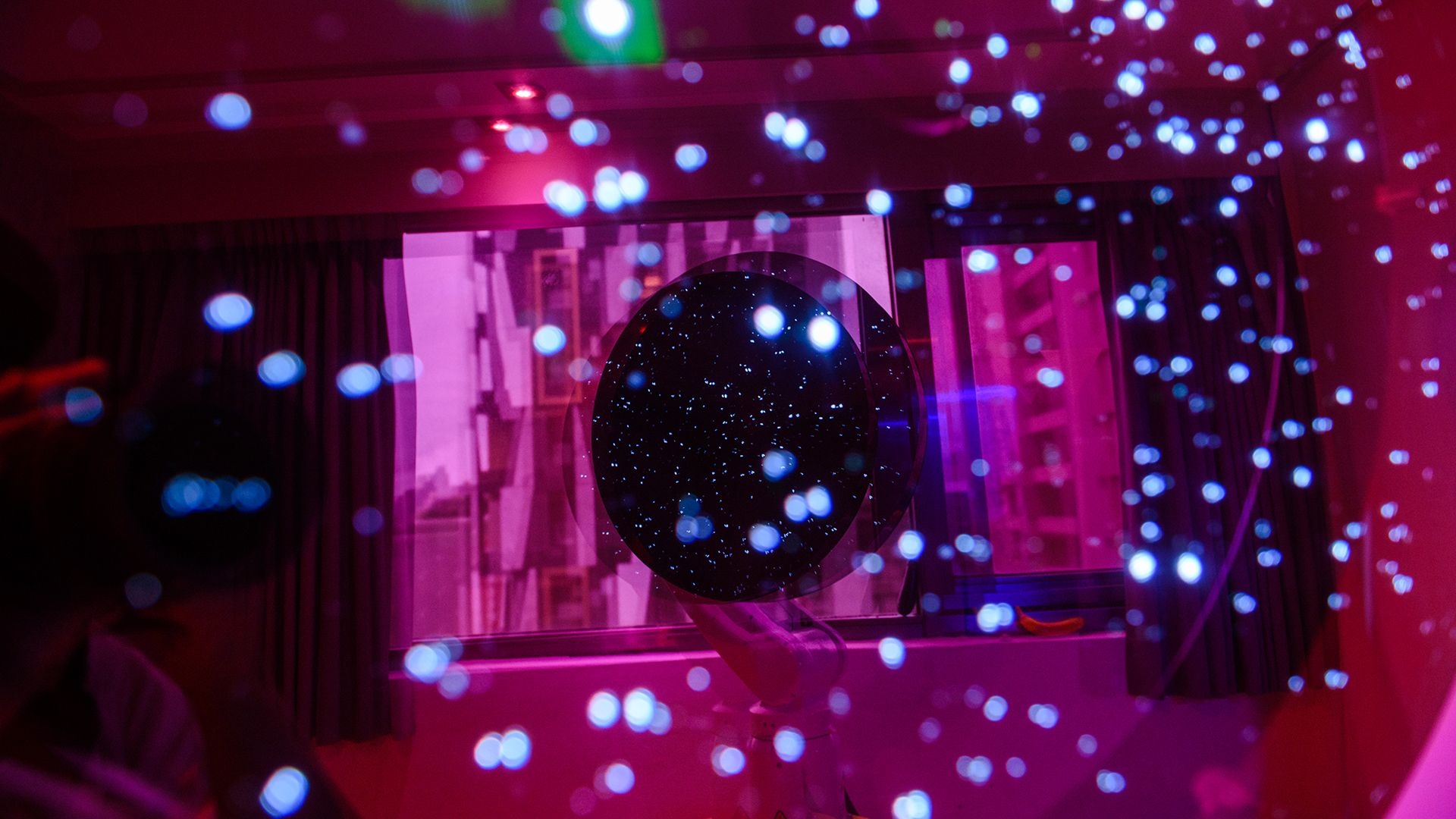 During the two-week exhibition, artists rented a room at the Chrysler Hotel and transformed it into immersive spacial experiences. Visitors to the exhibition must rent a 20 minutes slot at the counter and then enter the room alone to experience the works in an intimate way. Upon entering the exhibition room, visitors lie on a furry mattress surrounded by two robotic arms. The virtual girlfriend appears on the holographic projection screen mounted on the robotic arm, telling the audience the final story of the game.