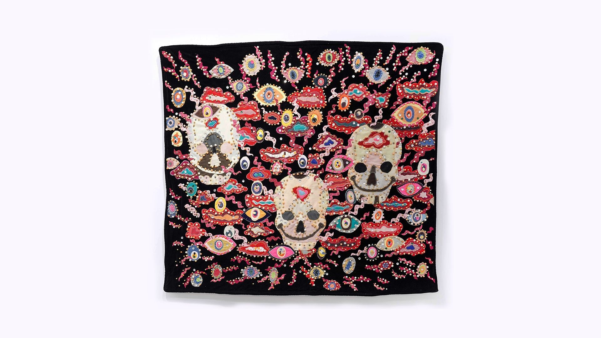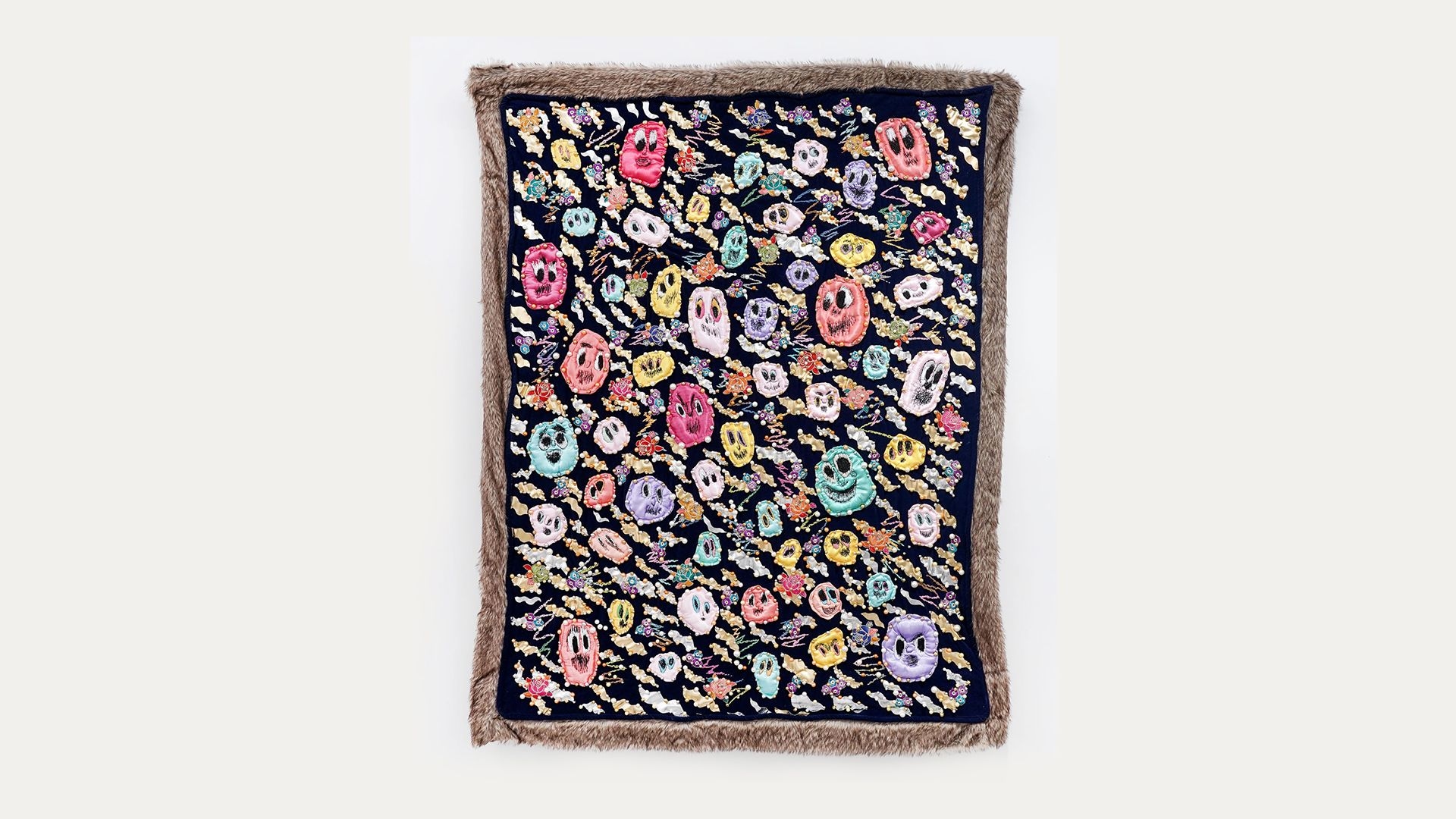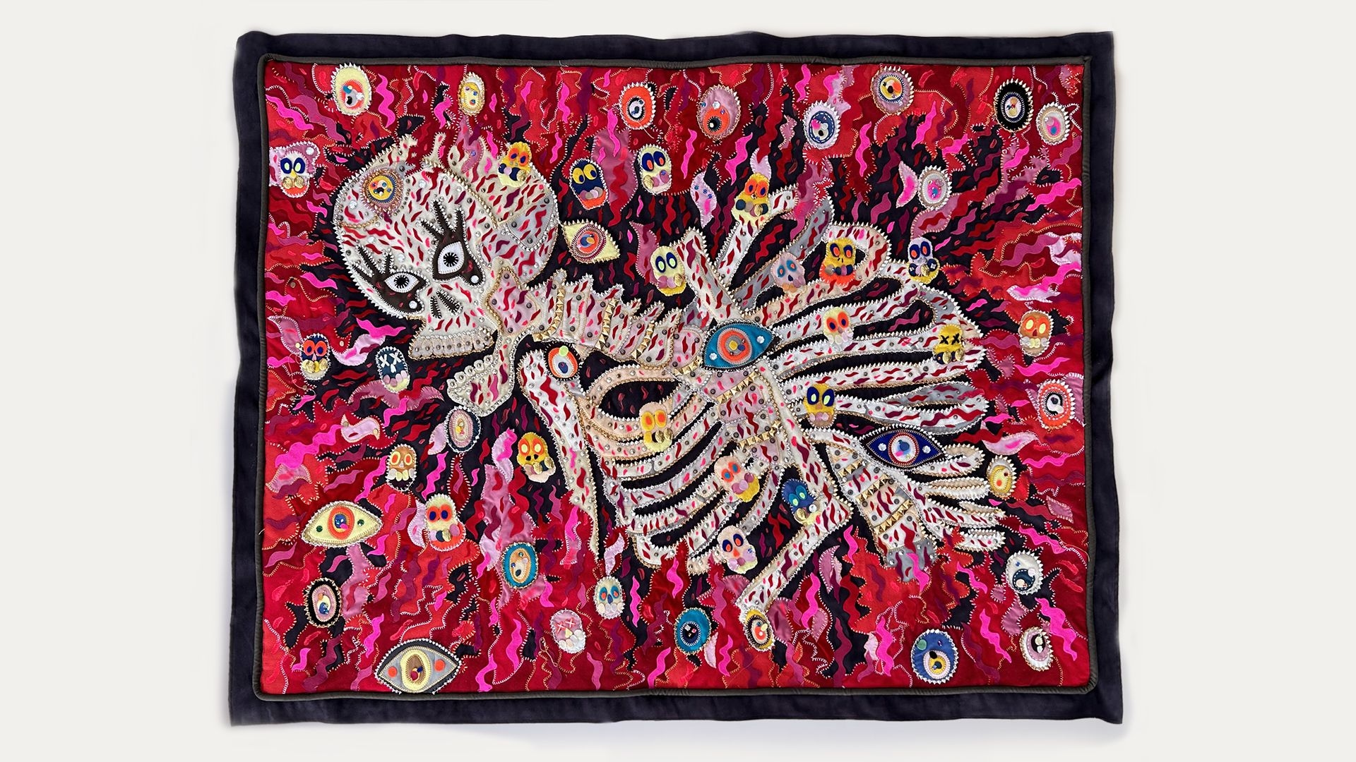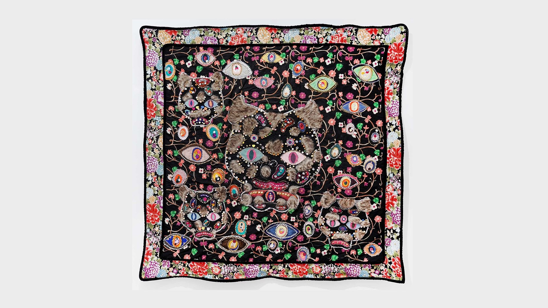 The series of tapestries takes found images and motifs from different cultures as its starting point and is layered with personal ideas through DIY crafts and decorated with numerous metal knickknacks. Some are actual clothing accessories, while others are only imitations of practical objects like stationary pins. The sewing machine and needle become the artist's brushes, embroidering intricate and eye-catching patterns on the fabric through embroidery techniques. Even with the assistance of modern machines, the production of tapestries still requires as much labor as it did hundreds of years ago, creating a strong contrast between the high demand for craftsmanship and the virtual digitization of contemporary society.