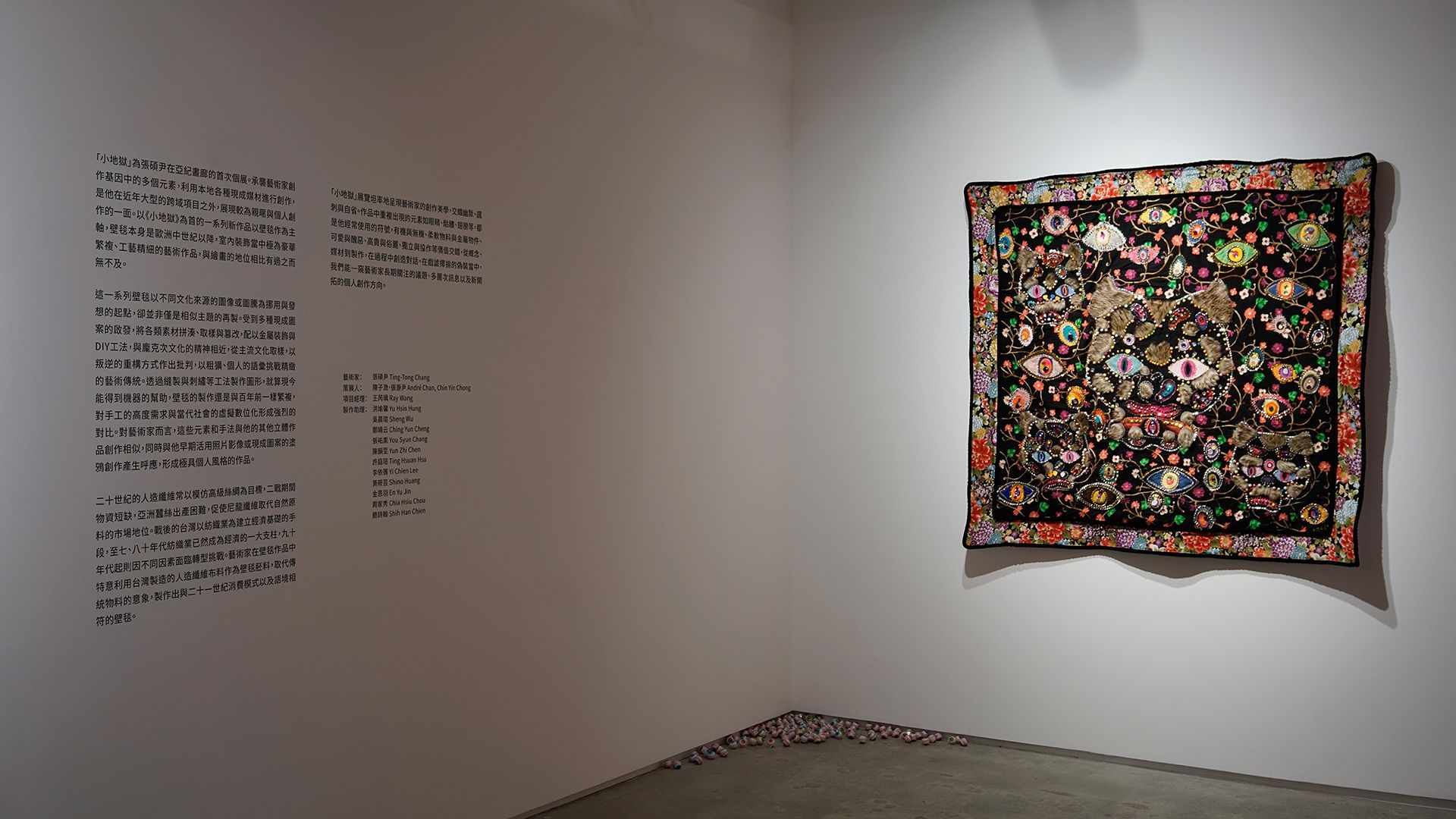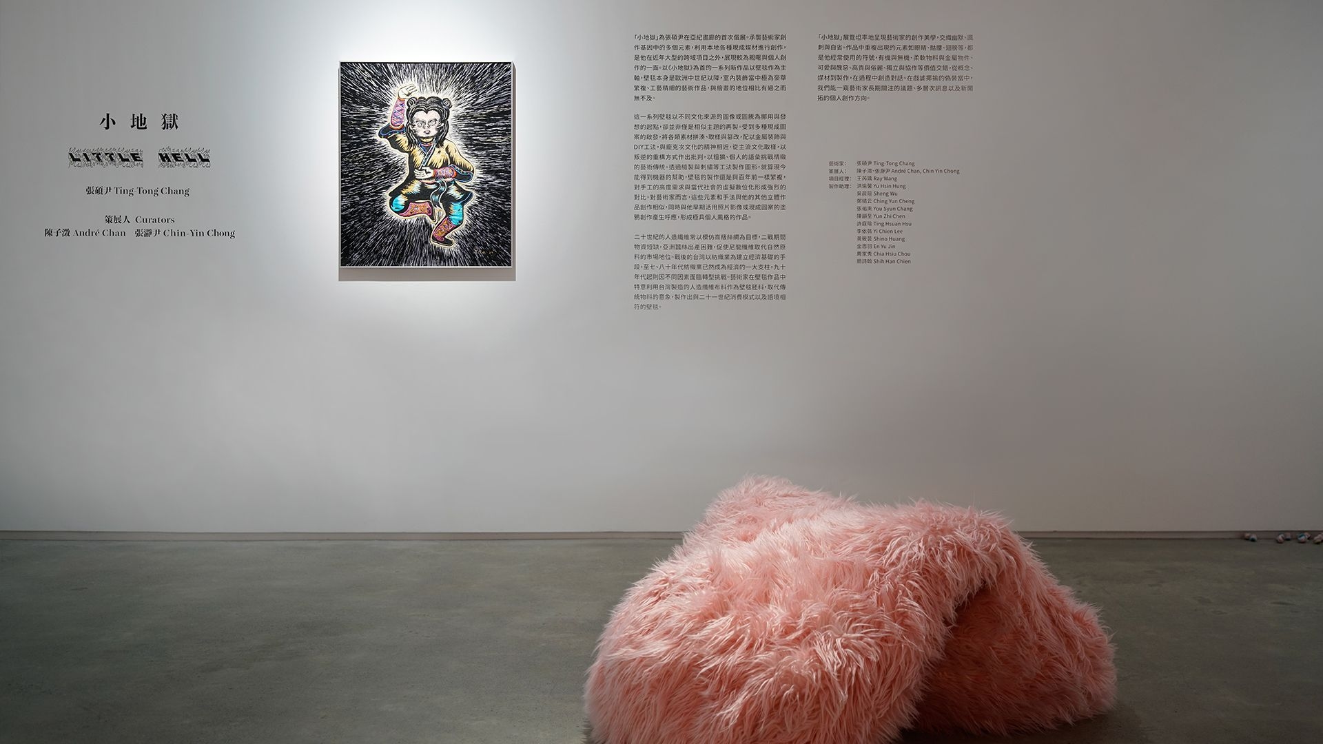 "Little Hell" serves as Ting-Tong Chang’s inaugural solo exhibition at Each Modern. The exhibition will showcase a more intimate and personal side of the artist's work, in addition to his involvement in recent large-scale interdisciplinary projects. Featuring the centerpiece ‘Little Hell’, the series of works focuses on tapestries, which since the Middle Ages have been luxurious and intricately crafted art forms in interior decoration, rivaling the status of paintings. The series inherits multiple elements of Chang’s creative DNA, utilizing various locally found materials for artistic creation.