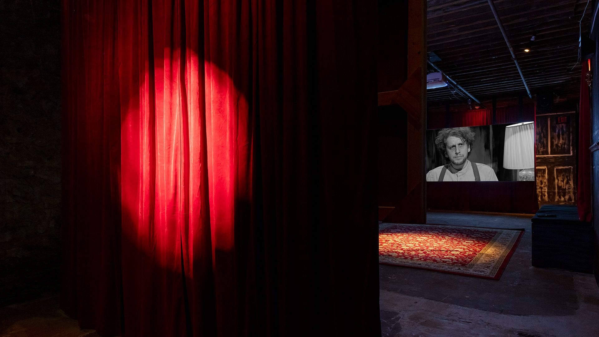 The device is further complicated by the casting of museum staff as the film’s actors. What emerges is not only a behind-the-scenes view of the creative process, but also an intimate portrait of everyday museum labor. Alongside rehearsals and set construction, we see staff using the copy machine, greeting visitors, and joking during morning meetings. The result is a layered metanarrative that dissolves the boundaries between art and labor, performance and production. Through its structure and story, The Hidden Shift invites viewers to confront questions surrounding capitalism, the meaning of work, and the precarity of the so-called “creative class.” This blending of reality and fiction extends beyond the screen into the exhibition space itself. Visitors encounter remnants of the film set—hand-painted backdrops, leftover props, and dramatic lighting—situating them within the physical traces of the production. By placing the audience inside these material remains, Chang creates a bodily experience that unsettles the boundary between what is real and what is constructed. We find ourselves unwittingly stepping onto a stage that slowly reveals itself.