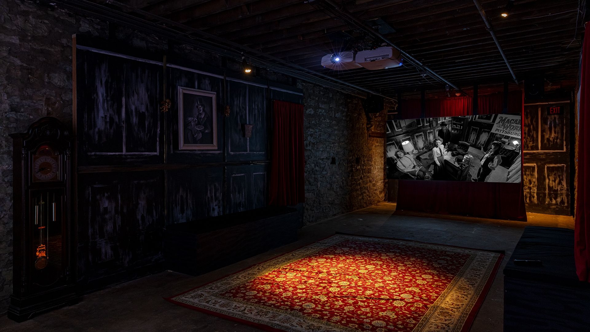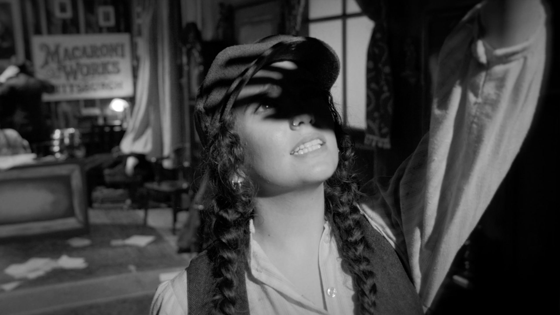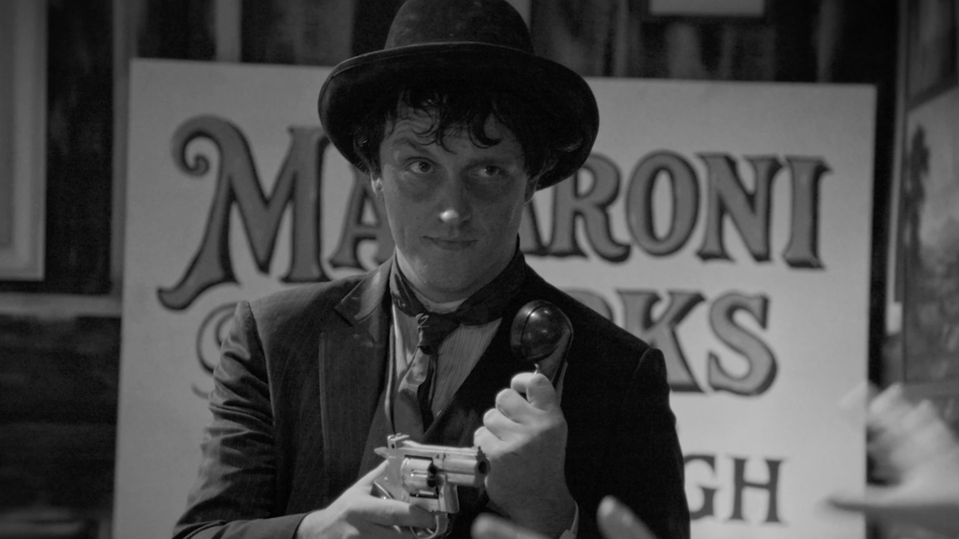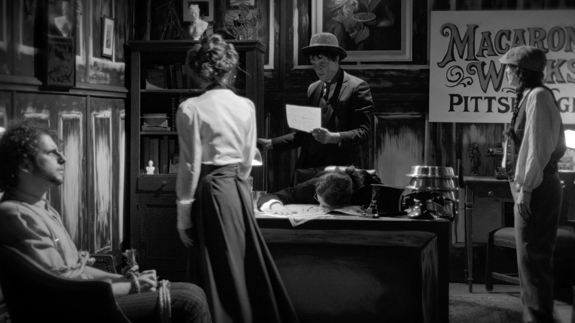 Responding to this history, as well as to the Mattress Factory’s own layered past of industrial and cultural production, the artist collaborated with local filmmakers Alex Abrahams and Benny Shaffer to weave these threads into a single narrative. The resulting work is a film noir–inspired murder mystery set in a fictional macaroni factory, where the factory owner is found dead and each character carries their own motives and suspicions. Originally conceived as a three-act stage play, the work is presented here alongside a documentary-style “making-of” film. It is both a film and a film about the making of that film. This dual structure creates a constant slippage between fiction and reality, narrative and process.