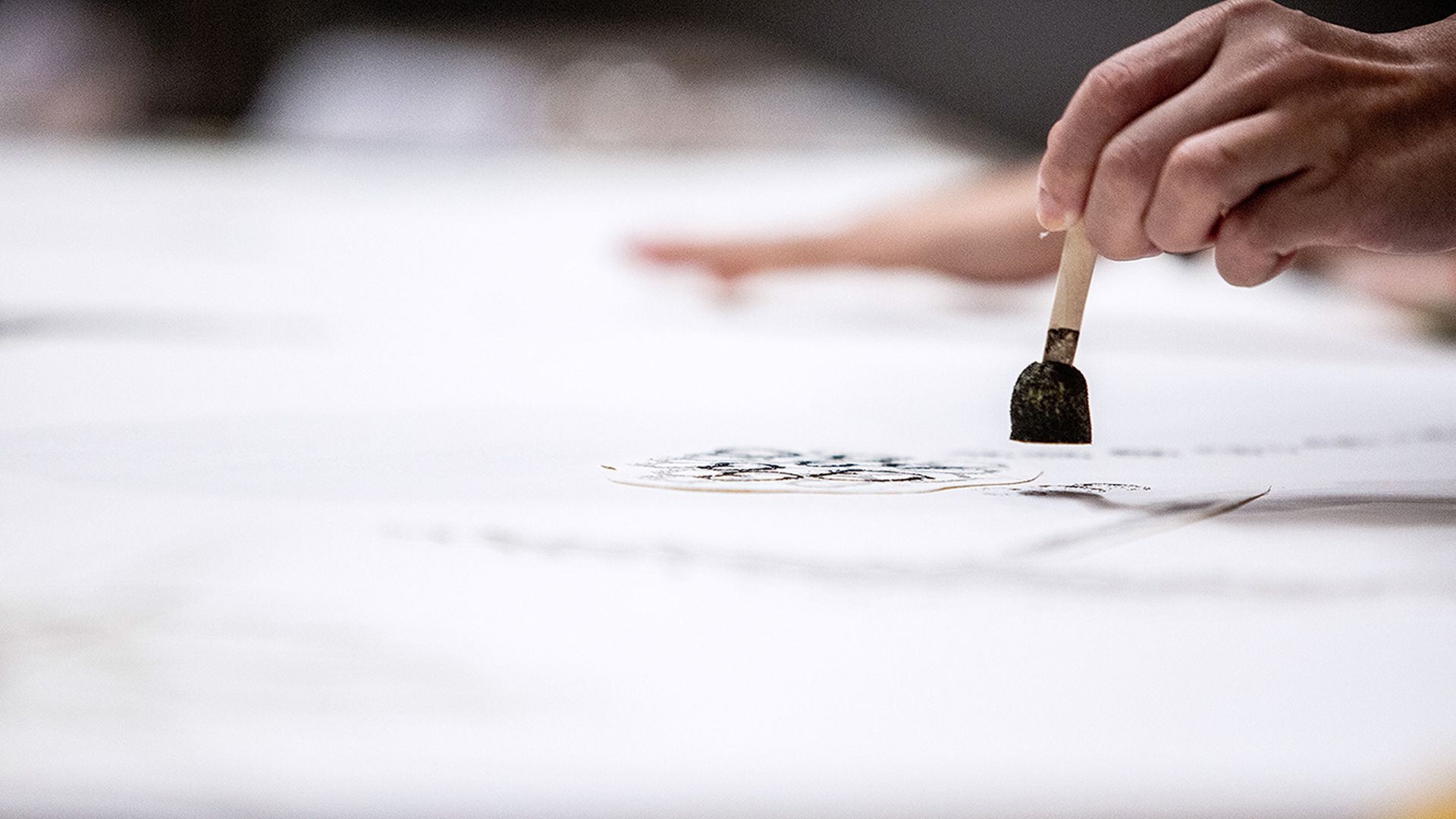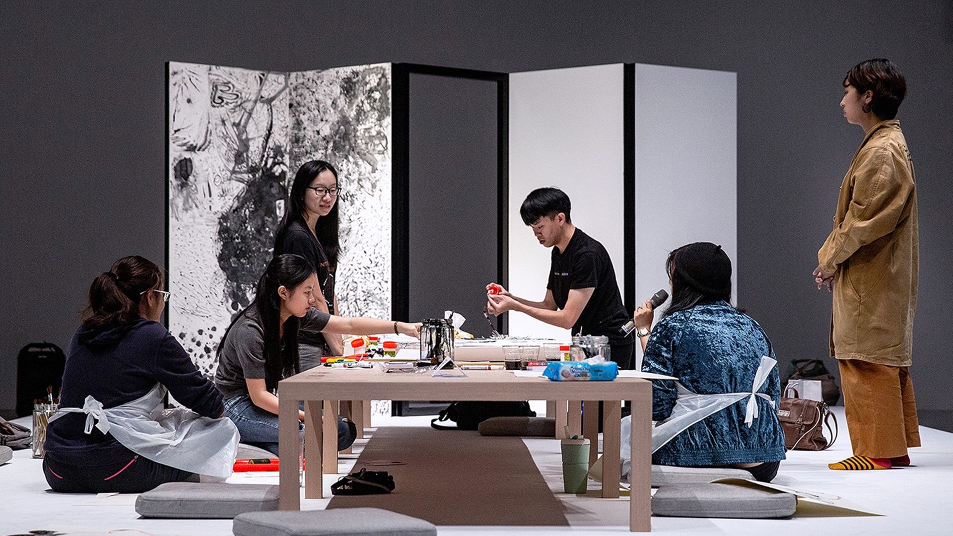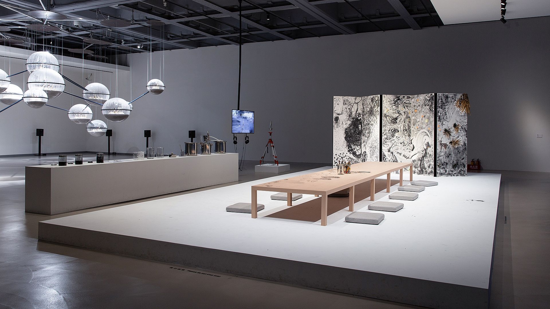 For the opening of the exhibition, Chang produces new iterations of Xia Gui’s Pure and Remote View of Streams and Mountains using his pollution-inks; these paintings will slowly be replaced by those produced in the public workshops.