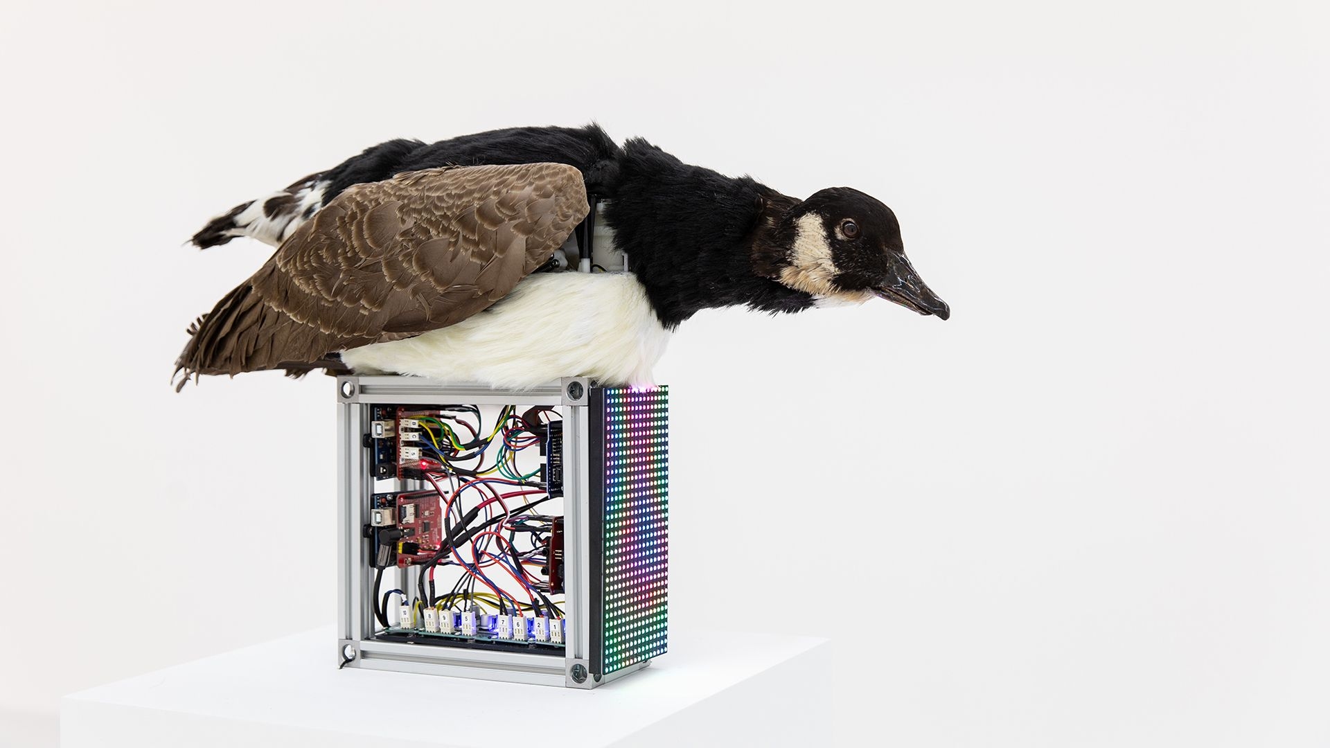 The materials used in this artwork were acquired from certified taxidermists and the specimens used were birds that have died of natural causes or roadkill.
