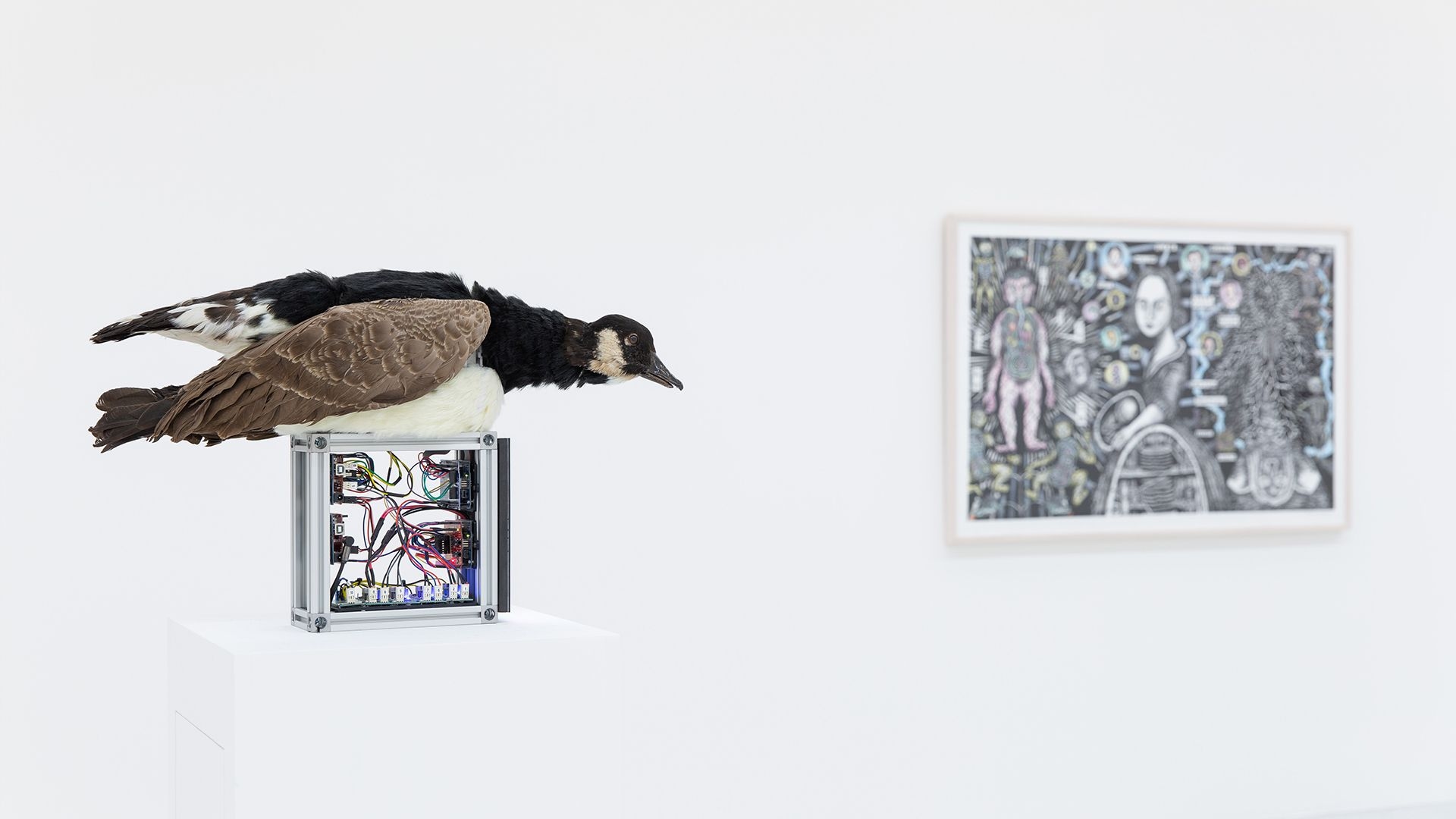 Referencing this historical recount, the artist created two contemporary digesting ducks. The kinetic installations are seen shaking their heads and flapping their wings, while narrating contemporary medical studies on the human microbiome, which is an aggregate of microorganisms that resides in the guts and forms a symbiotic relationship with its host through an extended evolutionary process. It is intricately connected to the human eating habits, emotions, and health conditions. Studies on the human microbiome have led to the medical approach of seeing the stomach and bowels as a mechanical system: Through probiotics and medical procedures, humans are able to reinforce and “upgrade” the microbiome residing in their digestive system.