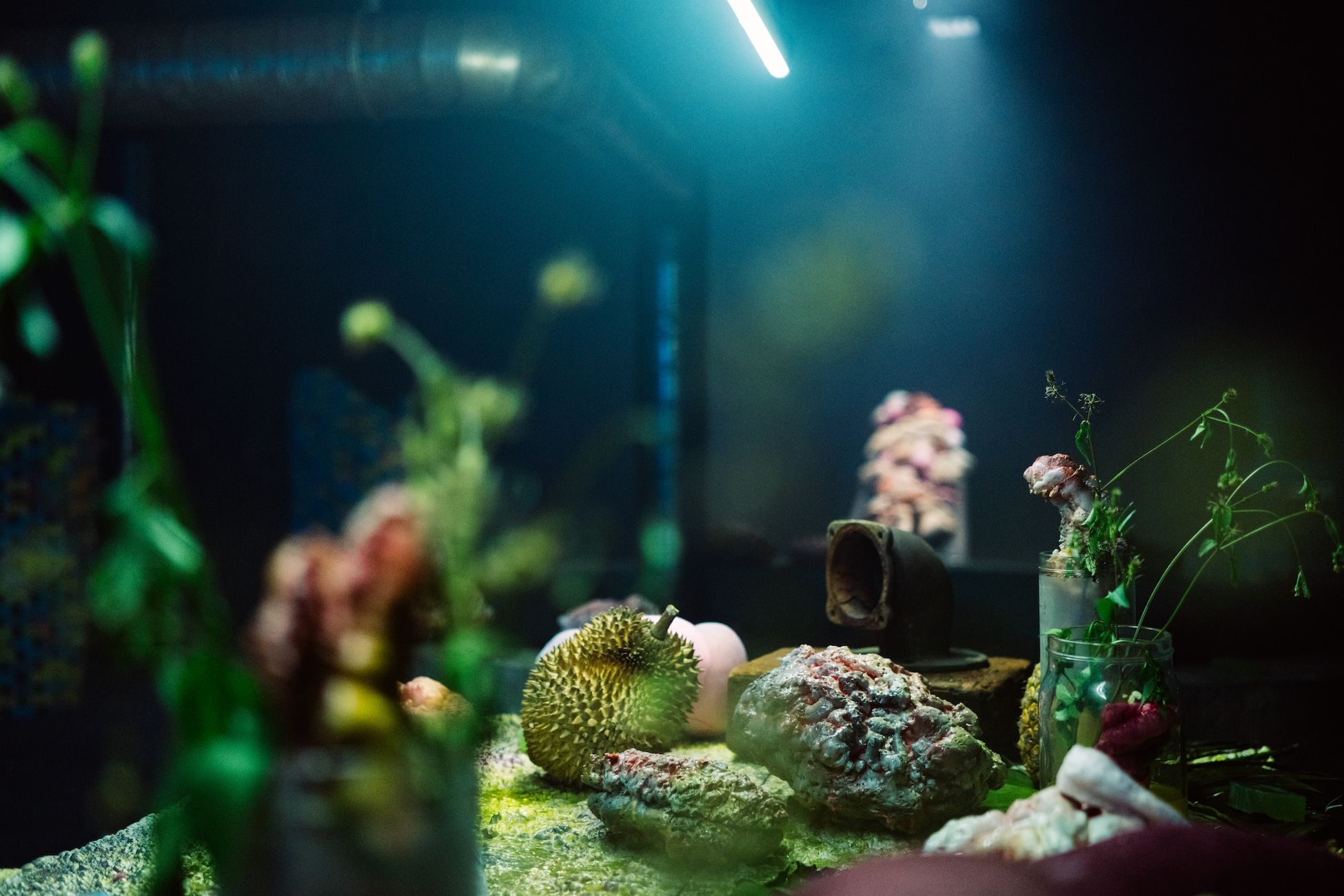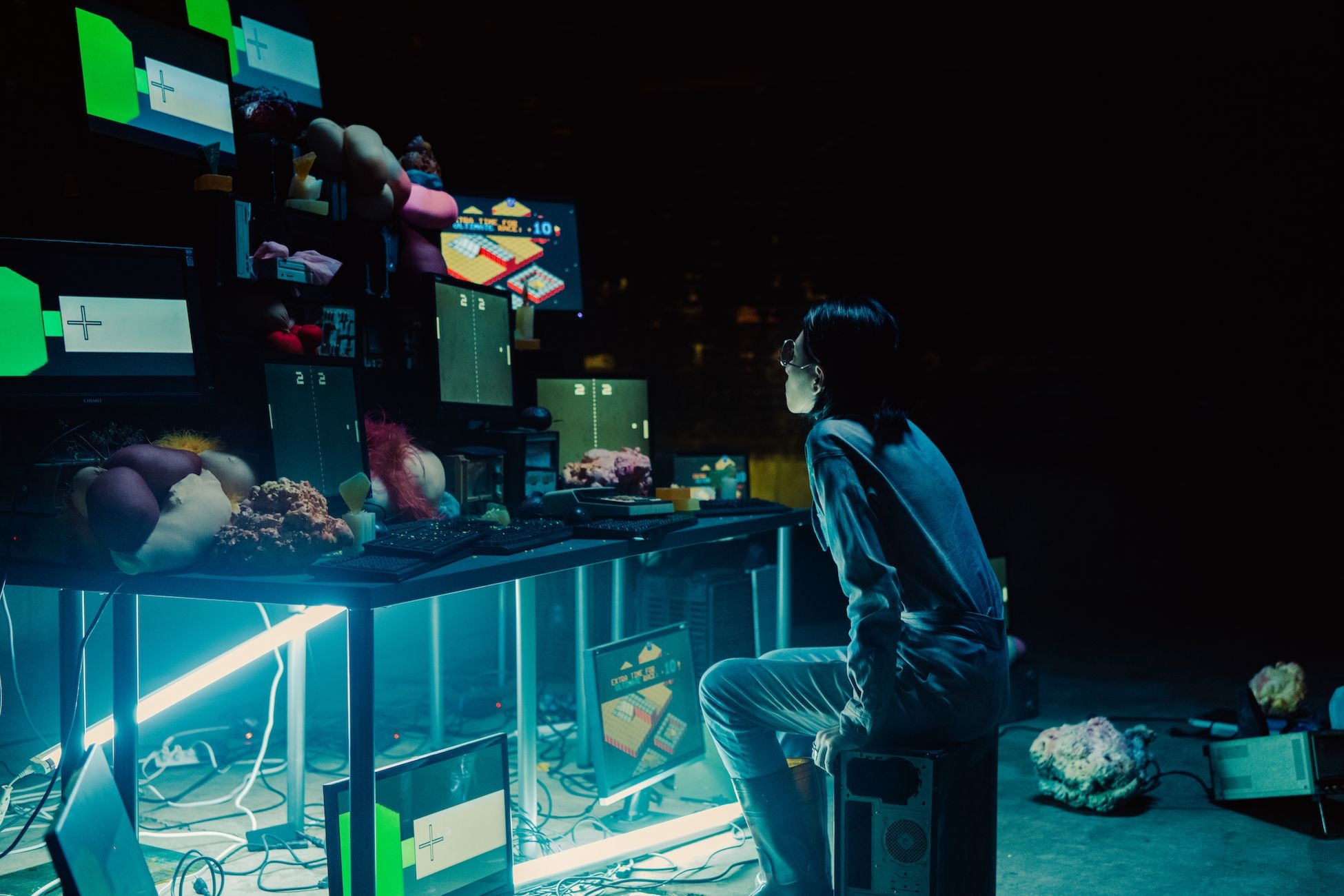 The artist invited performers to play different roles in the production process, such as workers who mechanically inspect soap on the conveyor belt and long table, victims sinking in large mixing tanks, and indifferent managers. Both the factory and the performance refer to how information is mass-produced and consumed across different media and social platforms.